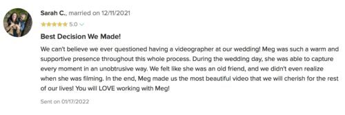 We can’t believe we ever questioned having a videographer at our wedding! Meg was such a warm and supportive presence throughout this whole process. During the wedding day, she was able to capture every moment in an unobtrusive way. We felt like she was an old friend, and we didn’t even realize when she was filming. In the end, Meg made us the most beautiful video that we will cherish for the rest of our lives! You will LOVE working with Meg!