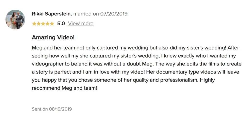 “Meg and her team not only captured my wedding but also did my sister’s wedding! After seeing how well my she captured my sister’s wedding, I knew exactly who I wanted my videographer to be and it was without a doubt Meg. The way she edits the films to create a story is perfect and I am in love with my video! Her documentary type videos will leave you happy that you chose someone of her quality and professionalism. Highly recommend Meg and team!”